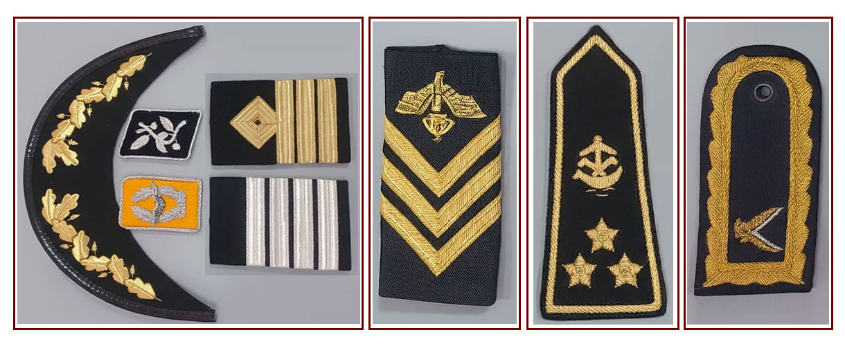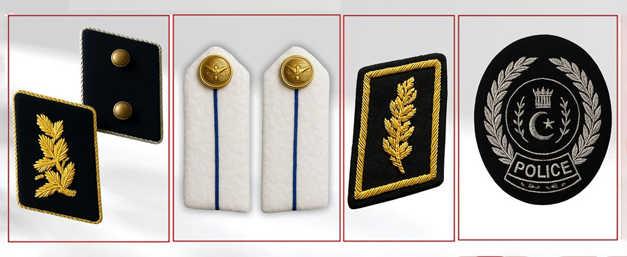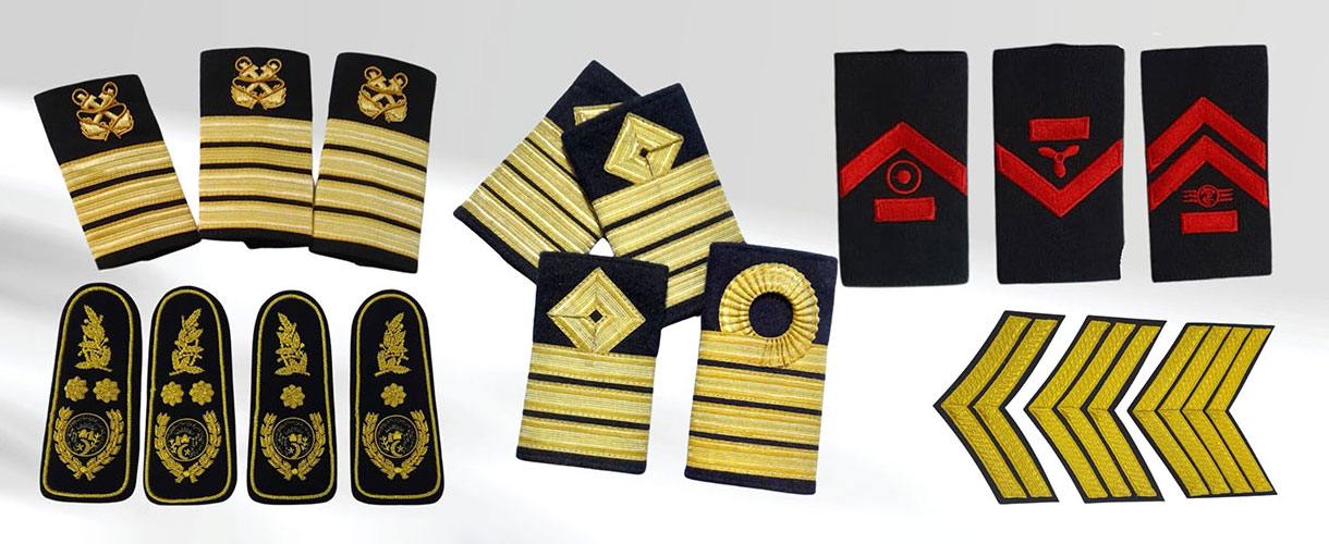 Military Uniform Accessories such as Hand Embroidered Badges, Machine Embroidered Badges/Patches, Shoulder Boards, Shoulder Ranks, Shoulder Sleeves, Shoulder Epaulettes, Peak Caps, Beret Caps, Honor Caps, Regalia, Cap Visor, Hand Embroidered Wings, Family Crests, Flags, Banners, Sashes, Chevrons, Ribbon, Laces, Chin Straps, Cap Cords, Glengarry, Lanyards, Tassels, Leather Belts, Regimental Badges, Metal Badges, etc.