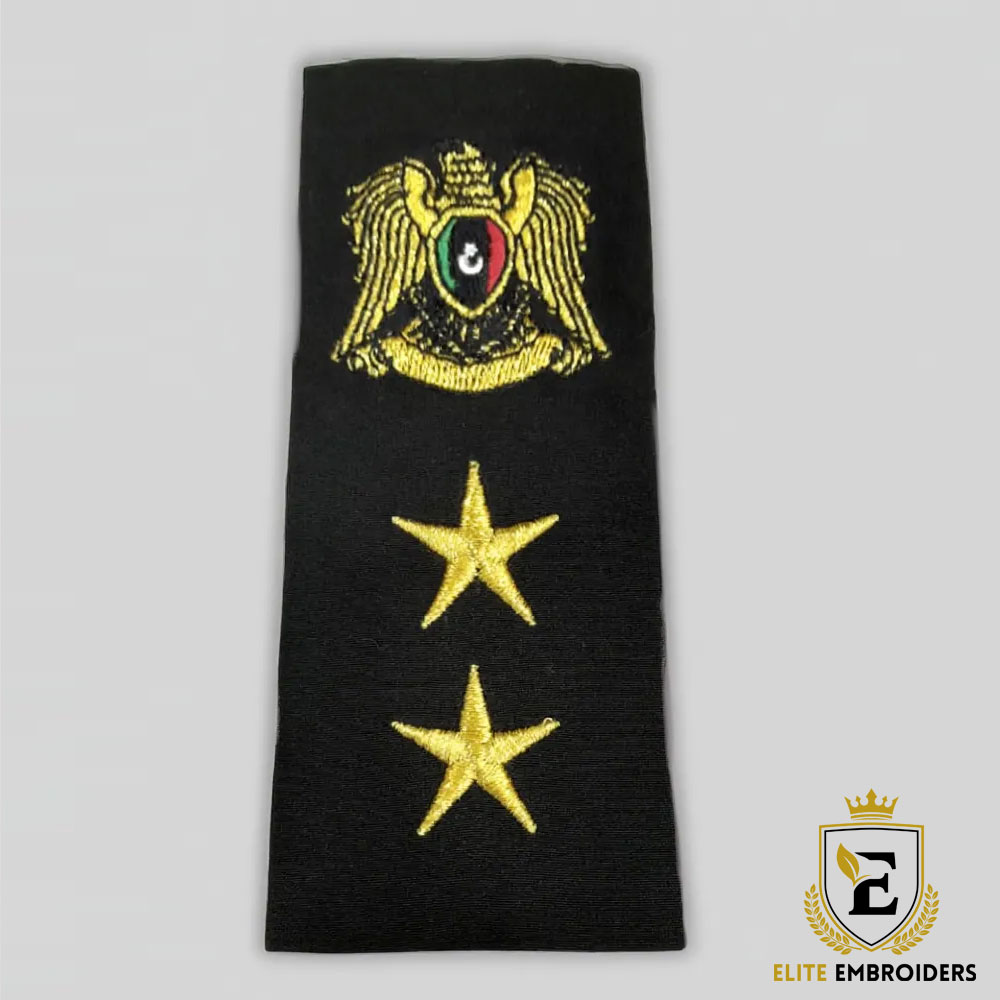 A sleek, black shoulder board featuring intricate gold embroidery. The upper portion displays the Libyan Coat of Arms (or a similar national/organizational crest), symbolizing high authority. Below it, two prominent gold stars are embroidered, signifying a senior field officer rank within military or security forces. The construction ensures a firm, formal look.