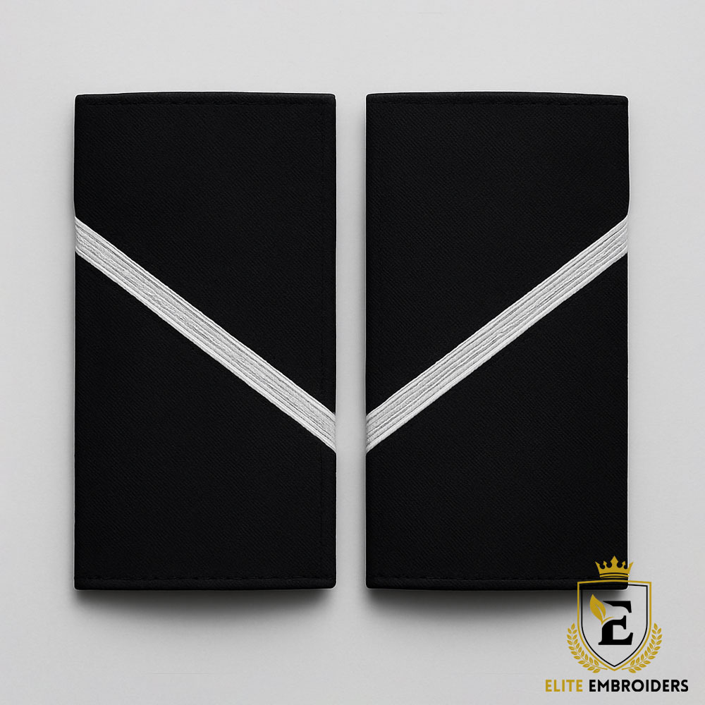 These epaulettes are simple but universally recognized as rank insignia for Non-Commissioned Officers (NCOs) or specific paramilitary/security personnel. They feature a single broad white/silver chevron (diagonal stripe) running across the black shoulder slide. The number of chevrons typically dictates the rank (e.g., one chevron for a Corporal, two or three for a Sergeant). This set displays the foundational element of this ranking system.