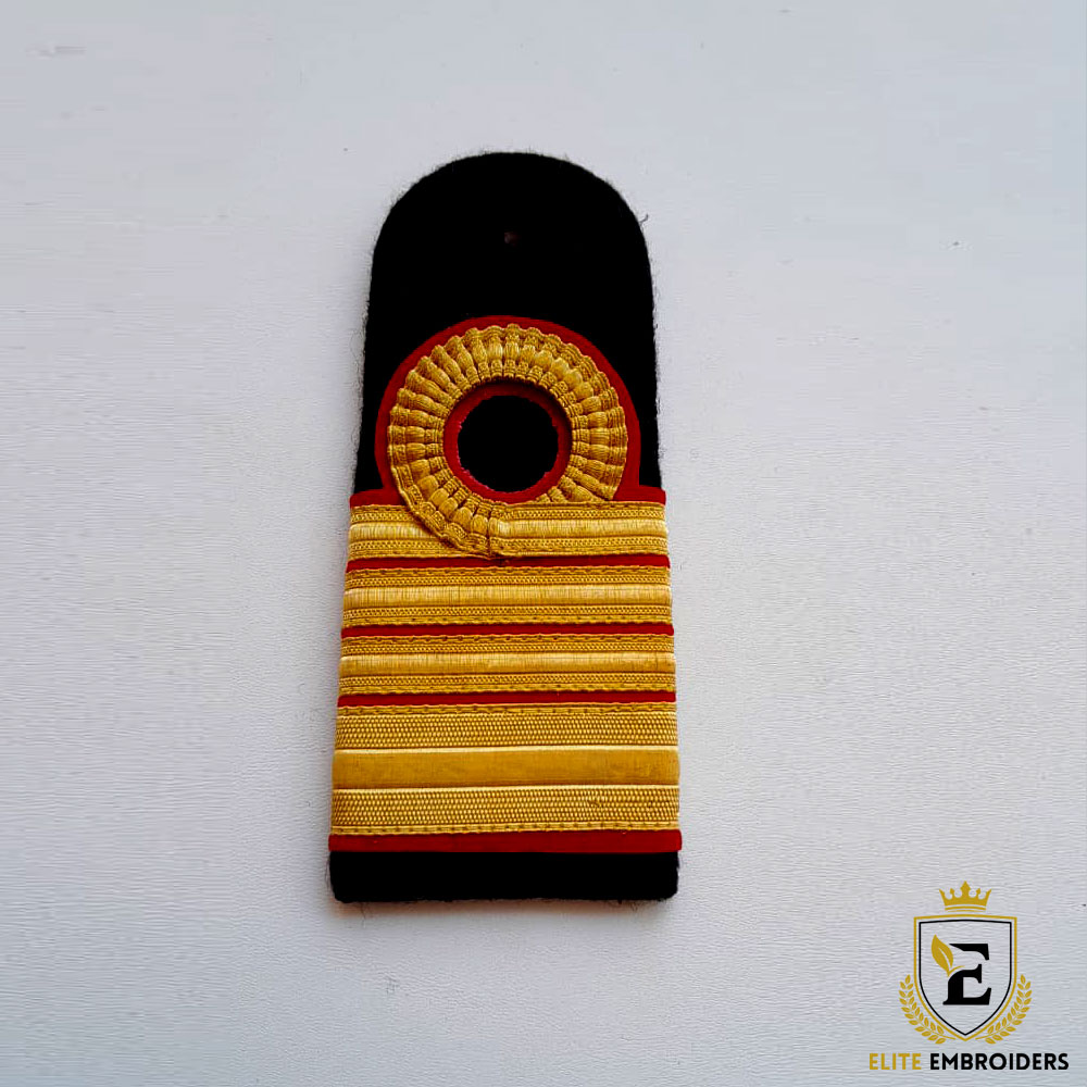* Insignia: Four $(4)$ gold stripes, Executive Curl, and red branch stripes.